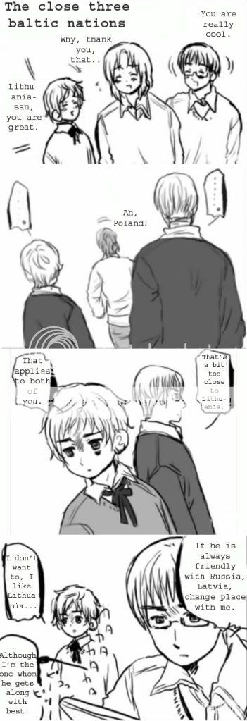 He's the youngest after Eduard and Toris (Estonia and Lithuania). Moments of togetherness bring the trio comfort and security. Lithuania is the nurturer, supportive and responsible. Estonia is the levelheaded one, wise and fast to get to the bottom of things. It's no secret that Raivis is dependent on them both, easily bullied by Russia and still too shy to stand up for himself. But his relationship with his brothers has its share of communication barriers, after being split apart many years ago lead to the three of them to developing different cultures, interests, and ideas of what's best. He's wanted a closer relationship with Toris, but with so much of his attention and time held elsewhere, they've had to support each other in smaller ways. And though Eduard is usually the first to notice when Raivis is in peril, the real loyalty held between them sometimes appears strongest out of mutual benefit more than affection.